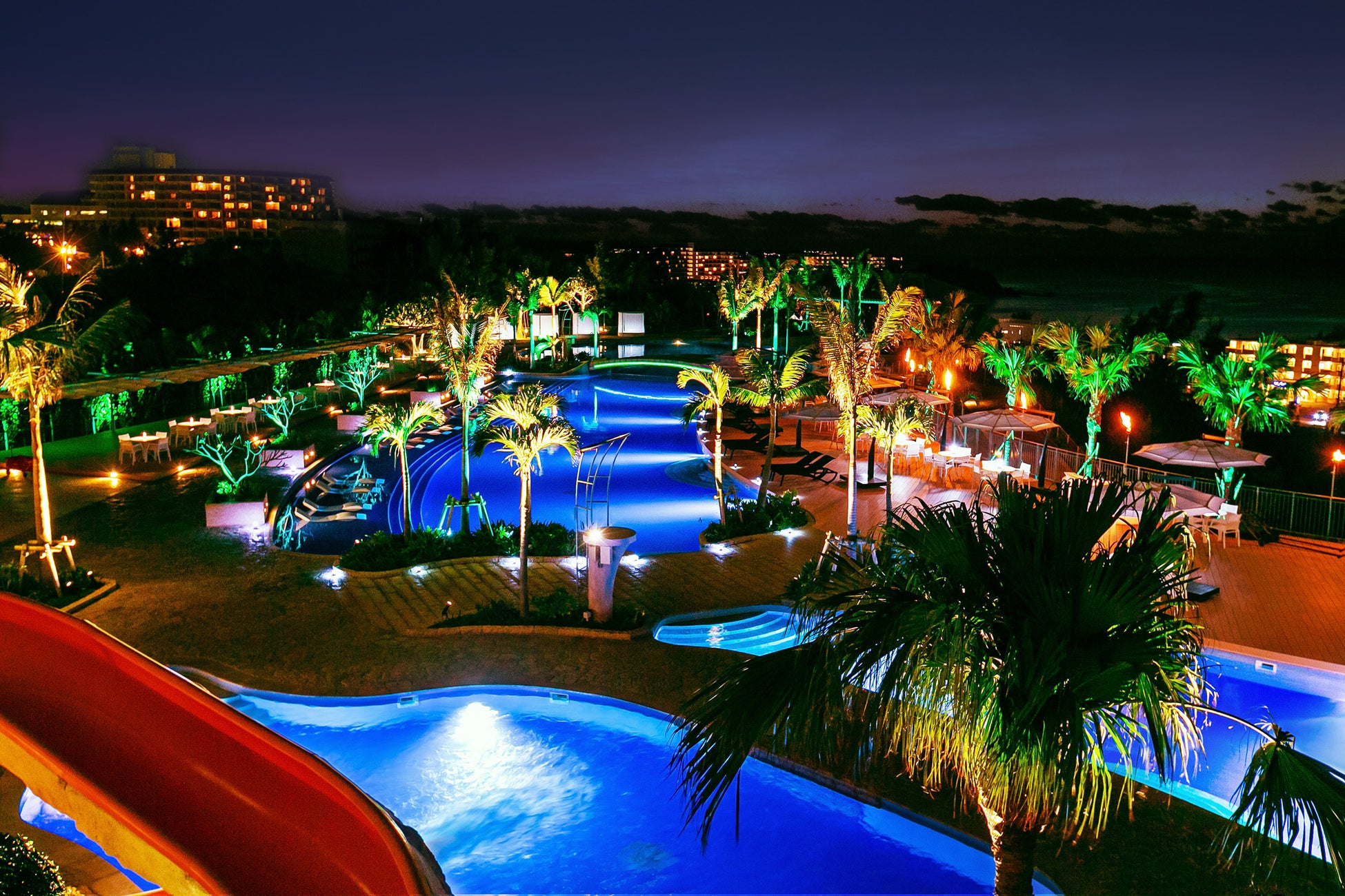 恩納村の美しい海を望むこのホテルには、沖縄では珍しい「波の出るプール」があります。さらに、ドーム状の滑り台「バブルヒル」は子供たちに大人気!まるで遊園地のような楽しさで、子供たちは何度でも滑りたがります。屋外プールと屋内プールの両方を完備しているため、天候を気にせず楽しめるのも嬉しいポイントです。